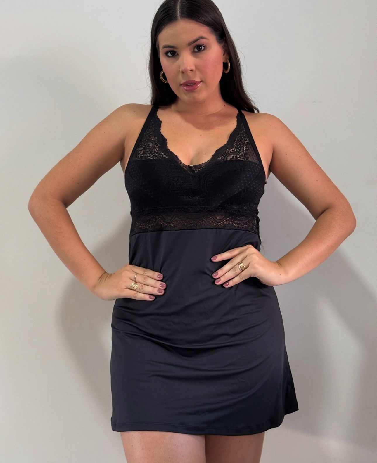 A renda delicada nas costas e cintura cria um contraste marcante com o tecido acetinado e leve, garantindo um visual impactante tanto de frente quanto de costas. E o melhor: acompanha calcinha para um look completo e irresistível.