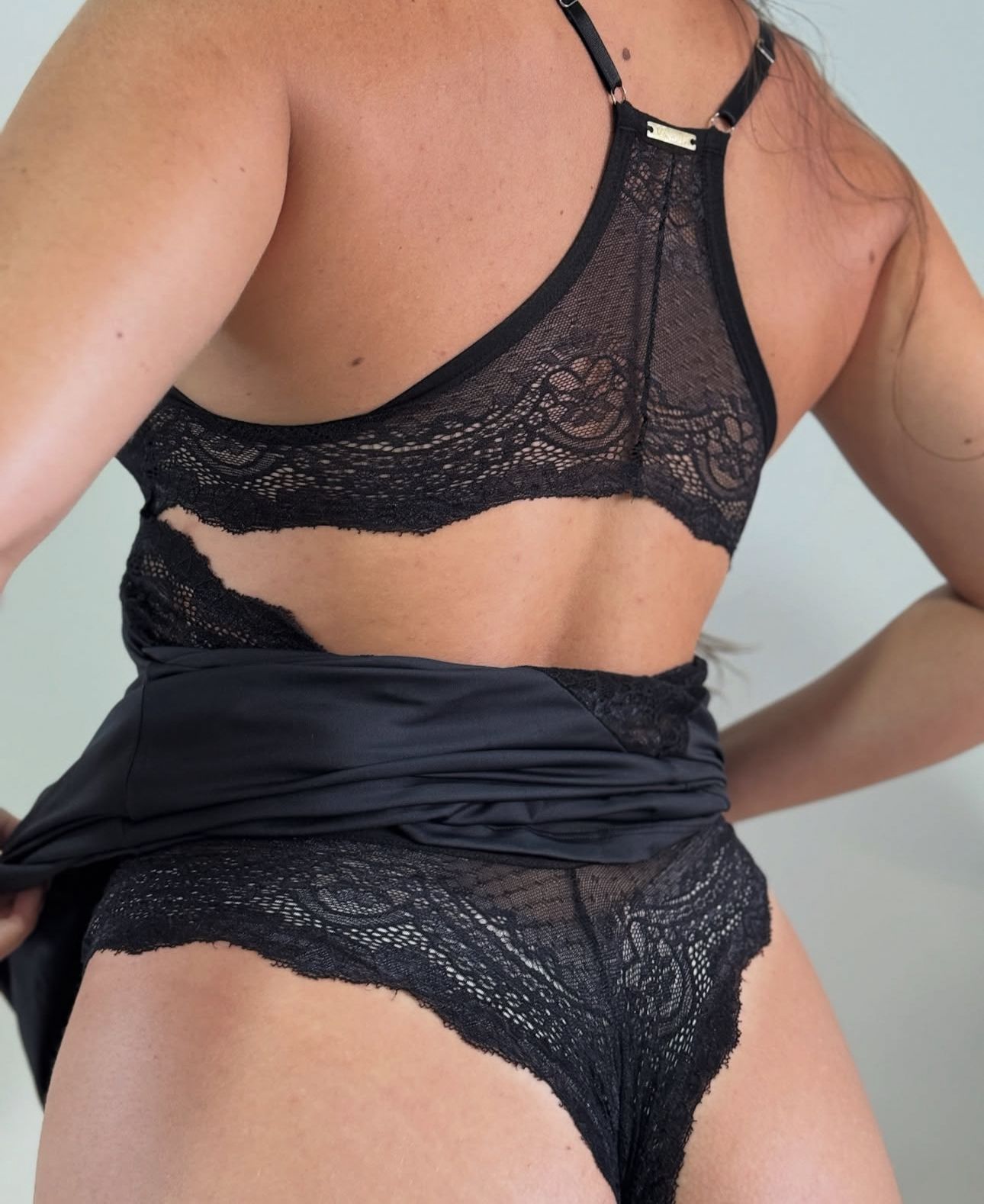 O decote profundo valoriza o colo, enquanto o detalhe central com pingente traz um toque de brilho e sofisticação. Acompanhada por uma calcinha combinando, é o conjunto perfeito para noites de paixão.